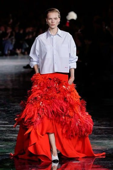 الأزهار حضرت عبر أطقم محاكة ومطرزات من الخيوط الملوّنة، وتنوّعت التنانير بين ميدي وأخرى بطول غير متماثل، منسّقة مع قمصان من توقيع Charvet أو مع تيشيرتات أنيقة، وكان ختام العرض بتنورة شراريب ملوّنة وتيشيرت ساتان أبيض في مزيج سريالي.