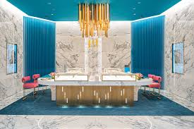 يتميز تصميم بوتيك مارلي نيويورك في الرياض بواجهة رخامية جذابة وشاشة معدنية مبتكرة، مما يهيئ الزوار لتجربة فريدة. يتكون البوتيك من أربع مساحات، تبدأ بممرات ذات تضليعات زرقاء مموجة وأرضية رخامية تقود إلى عالم من الفخامة.