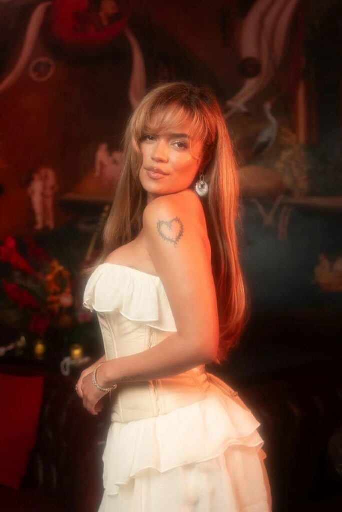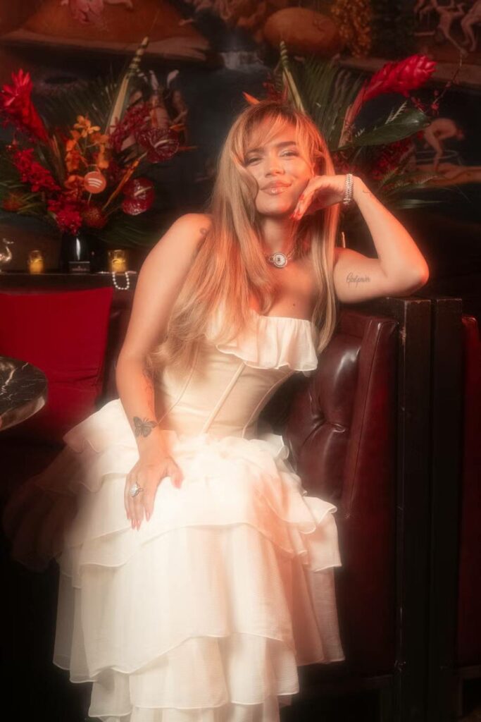 في حفل إطلاق ألبومها “تروبيكوكيتا” في نيويورك، نسقت كارول فستاناً عاجياً طويلًا مع مجوهرات مارلي الفاخرة، لتجسد الإبداع الفني والترف العصري. - تيت مكراي – مجموعتا “Cleo” و”LIFE”