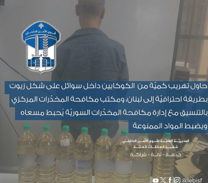 بتاريخ 04-11-2025، استلم مكتب مكافحة المخدّرات المركزي الموقوف عبر معبر المصنع، لإجراء المقتضى القانوني بحقّه، والتّحقيق جارٍ بإشراف القضاء المختص”.