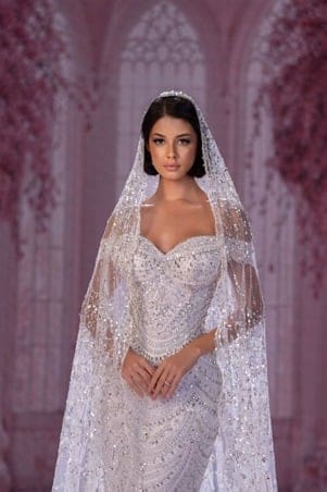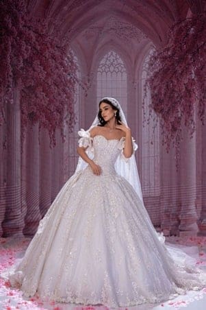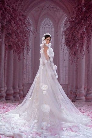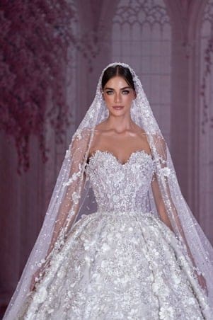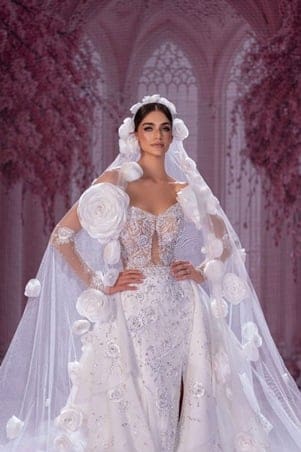 فستان زفاف أبيض دراماتيكي تزيّنه طرحة طويلة وأزهار ثلاثية الأبعاد، يعكس روحية الرومانسية المبهرة.