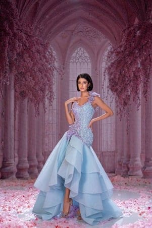 فستان أزرق سماوي مطرّز بخصر منخفض، تنسدل منه طبقات من الكشكش تشبه تموّجات الماء الهادئة.
