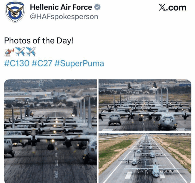 أثار منشور نشرته القوات الجوية اليونانية يتضمن صوراً لطائرات C130 تحت عنوان “صورة اليوم” غضباً في تركيا، وذلك بعد 48 ساعة فقط من تحطم طائرة تركية من الطراز نفسه في جورجيا ومقتل 20 جندياً كانوا على متنها.