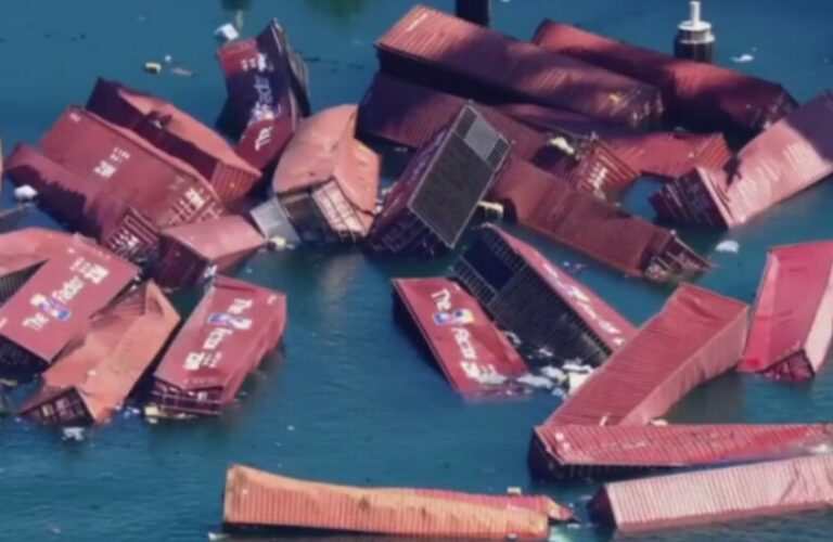 وأظهرت لقطات جوية عشرات الحاويات وهي تطفو في المحيط قرب رصيف &#٨٢٢٠;جي&#٨٢٢١;، حيث كانت السفينة، القادمة من جنوب الصين، قد رست قبل أقل من ٢٤ ساعة من وقوع الحادث.
