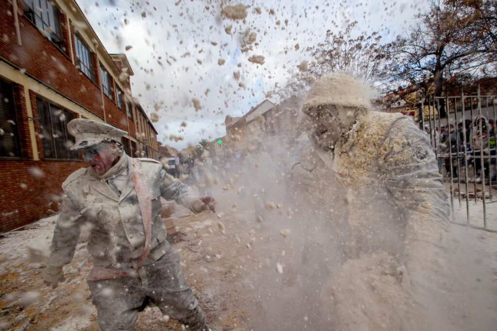 تحولت بلدة إيبي في أليكانتي جنوب شرق إسبانيا إلى ساحة معركة استثنائية خلال مهرجان “إلس إنفاريناتس” السنوي، حيث استخدم المشاركون البيض والدقيق كـ”أسلحة” في احتفال يعود تاريخه لأكثر من 200 عام.