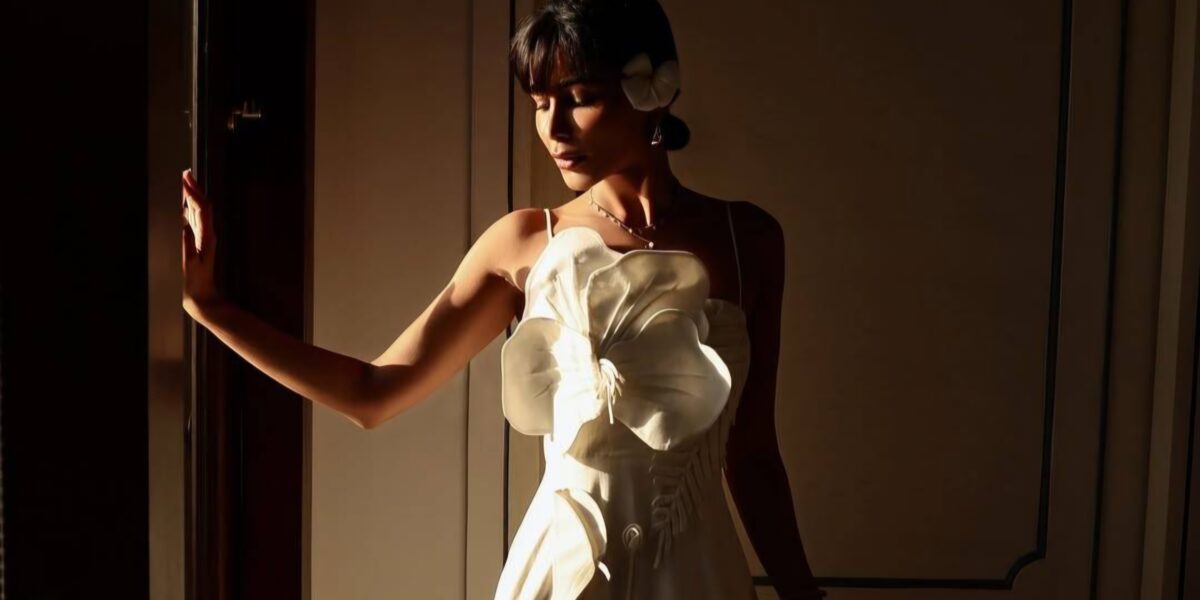 اختارت مهيرة فستاناً أبيض بتصميم بسيط يفيض بالتفاصيل الدقيقة، تميّز بحمّالات رفيعة وقصة ضيّقة من الأعلى، تتوسطها وردة ثلاثية الأبعاد مزدانة بتطريزات ناعمة على شكل سنبلة، فيما انساب من الأسفل بتنورة واسعة ذات ربطات أنثوية تضفي لمسة من الانسيابية والفخامة.