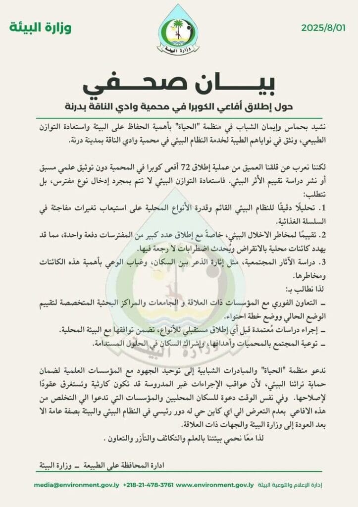 أثارت مبادرة نفذتها منظمة شبابية محلية بإطلاق 72 أفعى كوبرا داخل محمية وادي الناقة في مدينة درنة، قلق وزارة البيئة في حكومة الوحدة الوطنية، التي وصفت الخطوة بـ”غير المدروسة” وحذرت من عواقبها البيئية والاجتماعية.
