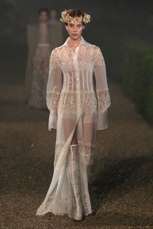 وسط أجواء درامية ضبابية ولمسات من المطر، سارت العارضات على منصة اتخذت شكل مشهد سينمائي، مرتديات تصاميم حملت توقيعًا فنيًا دقيقًا، حيث برزت فساتين الدانتيل الرقيق والشيفون الشفاف المنسدل بخفة، تتزين بالكشكش والتفاصيل الرومانسية التي تتقاطع مع مفردات الأزياء المسرحية والسينمائية.