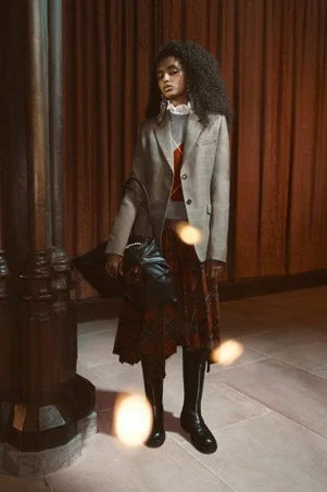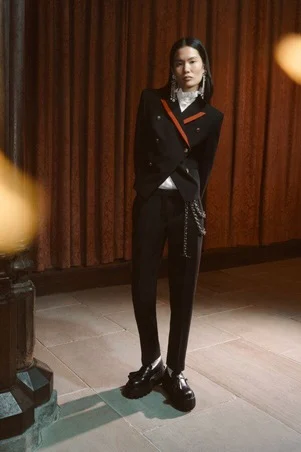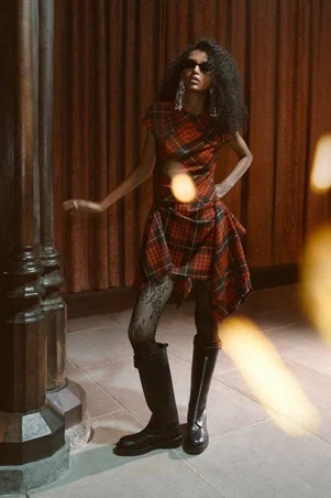 تبدأ المجموعة بلوكبوك متميز بتفاصيل تفكيكية في التايور؛ سترات العشاء تبدو مصغرة أو ملتوية عند reversها، مانحة الحركة ضمن هياكل كلاسيكية. تظهر خصور على شكل cummerbund في البدلات للجنسين، محددة الخطوط مع لمسة احتفالية. كما تمزج الفساتين المزينة بخطوط الرقبة على شكل صور الوريثة بين الوقار الأرستقراطي والحس العصري، فيما يظهر توقيع التارتان بشكل مقتصد لكنه فعال، من ميني برقبة عالية إلى معطف بياقة كورودوري وتنورة كيلت مطوية، لتجسيد التوازن بين التقليد وروح الشباب المتمردة.