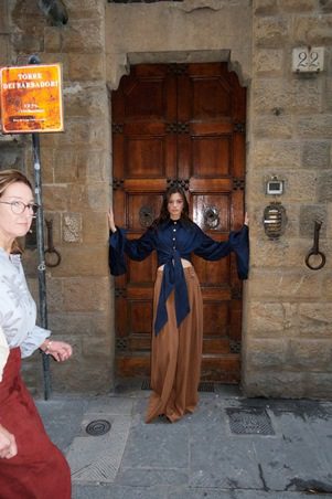 توازن القطع بين العملية والأناقة: طبقات محتشمة، أقمشة مريحة، خطوط واضحة، لتمنح حضورًا قويًا دون مبالغة. خامات مثل القطن، الحرير، الصوف، والبوبلين تُبرز القوام دون طغيان، في قمصان بهوية معمارية، فساتين تنساب كالحجر المنحوت، وخياطة دقيقة. أسماء القطع مثل Notte، Duomo، Loggia، Arno، Fiorenza تضيف هوية مميزة لكل تصميم.