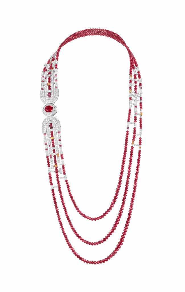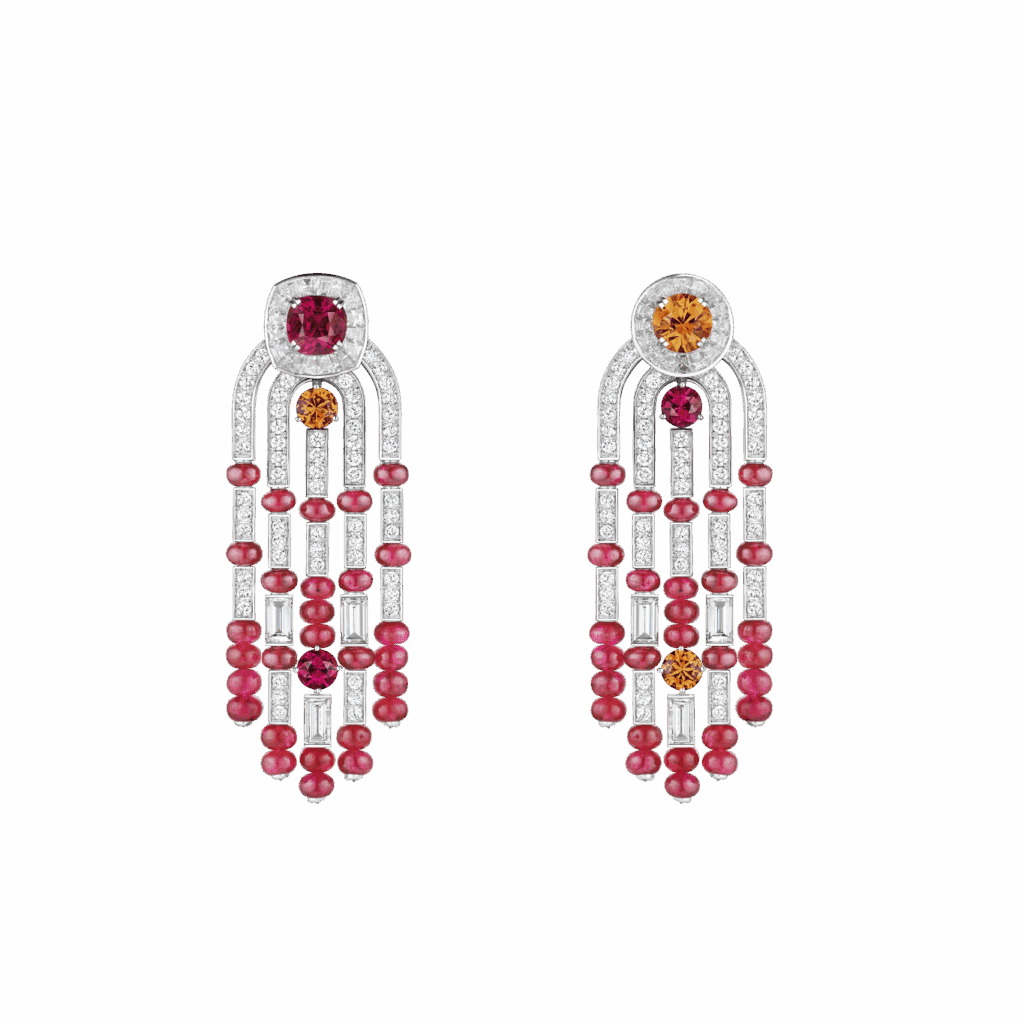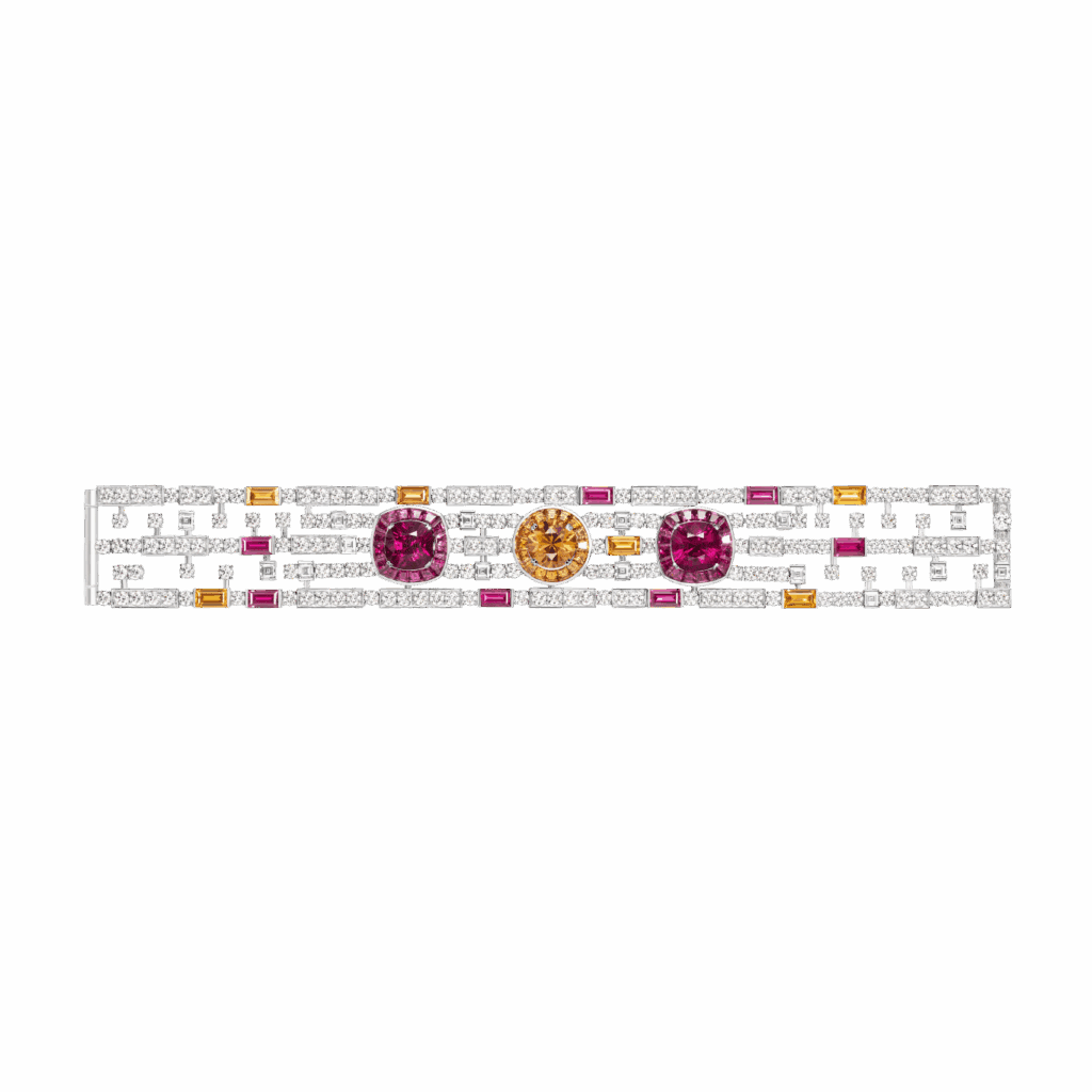 Blazing Audacity: مستوحى من حي لا بوكا، يعكس جرأة الألوان وإيقاع التانغو، مع حجر الإسبينل الأحمر والروبيليت الزهري وتدرجات الذهب الأبيض والألماس.
