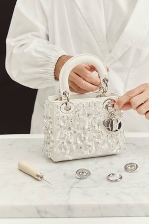 في مجموعة كروز 2026، قدّمت الدار إصدارًا مصغّرًا من الحقيبة الأيقونية بالجلد الأبيض الناصع، مزيّنًا بتفاصيل القطرات الشفافة التي تضيف إليها لمسة من النقاء والرقي. ليس هذا التصميم مجرّد قطعة فاخرة، بل عمل فنيّ دقيق يتطلّب مهارة استثنائية في كل مرحلة من مراحل تنفيذه — من تقطيع المكوّنات وتجميعها، إلى تثبيت كل قطرة بشغف ودقة متناهية.