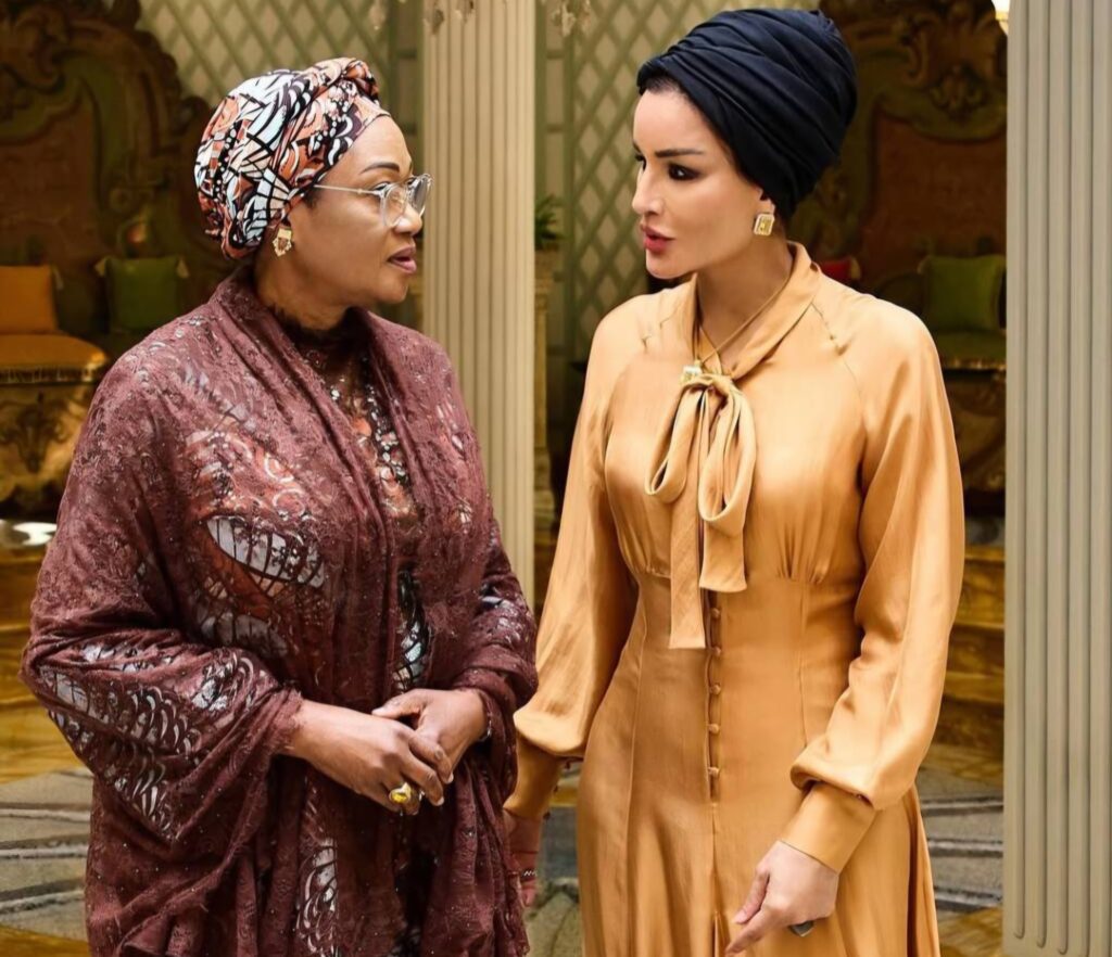 الشيخة موزة تخطف الأنظار بأناقة كلاسيكية في لقاء دبلوماسي مع السيدة الأولى لنيجيريا