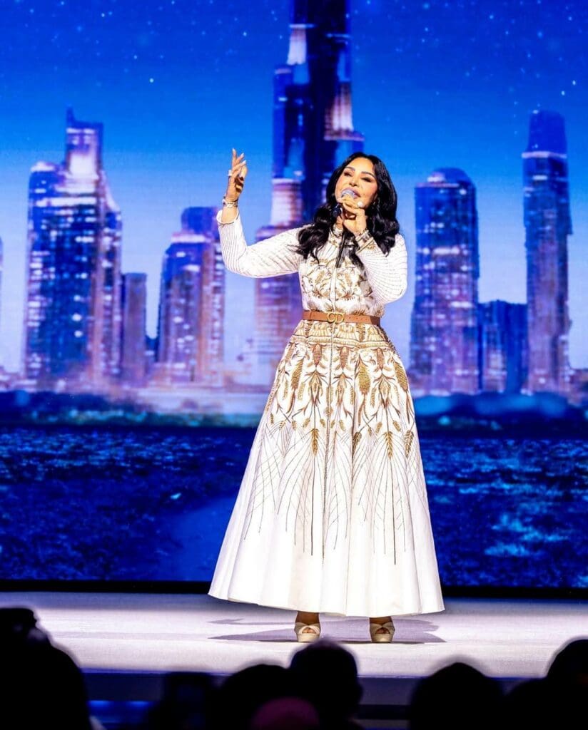 اختارت النجمة أحلام فستاناً ناعماً بتفاصيل شرقية رقيقة خلال مشاركتها في منتدى الإعلام العربي في دبي، حيث قدّمت أشهر أغانيها وأشعار سمو الشيخ محمد بن راشد آل مكتوم. وتألقت النجمة الإماراتية بفستان طويل باللون الأبيض العاجي من الحرير ومطرّز بالكامل بخيوط ذهبية على شكل سنابل، وتميّز الثوب بتصميمه الأنيق الذي يجمع بين الأناقة الشرقية واللمسات…