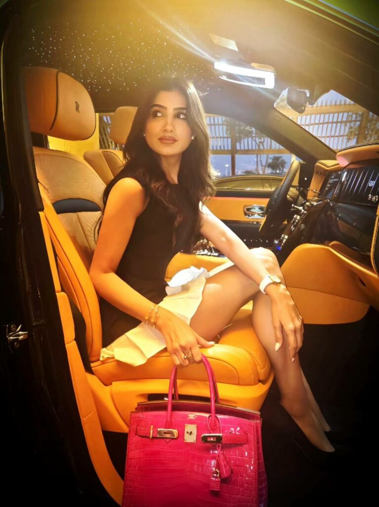 مي عمر تتألق بفستان أسود قصير وحقيبة “هيرميس” فوشيا